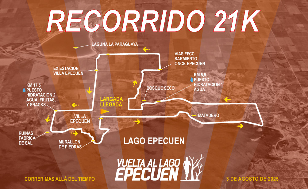 ¿CORRÉS LOS 21K? LOS DETALLES: Largada en el ingreso a las ruinas de Villa Epecuén, puesto de hidratación 1 en el km. 5, luego recorre un sendero de trail que atraviesa un bosque seco para dirigirse a una calle de arena, recorre senderos de campos cercanos que pueden tener bastante barro dependiendo del clima. En el km 8 cruzan un pequeño túnel bajo las vías del ferrocarril. Salida a una calle que puede tener bastante arena seca para dirigirse a la laguna La Paraguaya. Luego de circular por las barrancas de la laguna se dirigen a la antigua estación de Villa Epecuén y luego a las ruinas de la villa.