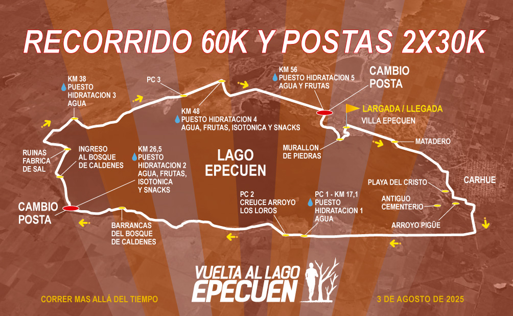 ¿CORRÉS 60K O POSTAS 2 X 30K? TODA LA INFO ACÁ: Largada de corredores de 60 k e integrante 1 de los equipos de Postas (el corredor 2 de la modalidad postas será trasladado desde el lugar hasta el Puesto 2). La salida será en el ingreso a las ruinas de Villa Epecuén, circuito guiado durante los primeros 10 kilómetros en horario nocturno por calle de tierra y un corto tramo de asfalto sin dificultades en el terreno. Luego se ingresa en un camino vecinal con marcas refractarias hasta llegar al Puesto de hidratación 1, deberán seguir las indicaciones de voluntarios ya que para los primeros aún será de noche. Los primeros metros después del Puesto de hidratación 1 deberán tener cuidado con los pozos en el terreno ya que suelen estar ocultos entre los pajonales. En el km 17,5 cruzarán el primer arroyo, en ese lugar habrá un voluntario con iluminación para que los primeros puedan verlo a la distancia. En el km 19 ya estarán en la costa del lago con un suelo calizo y con mucha laja suelta. El trayecto hasta el Puesto de abastecimiento 2 será uno de los tramos más duros, con mucha laja y piedras de diversos tamaños, cuidado con los tobillos hasta el Puesto de Abastecimiento 2 en el km 27. Allí se producirá el cambio de corredor/a para los equipos de Postas 2 x 30K. En este puesto deberán prestar especial atención para salir bien abastecidos de comida, agua e isotónica ya que tendrá un largo tramo sin asistencia, también podrán tomar una infusión caliente en el fogón.