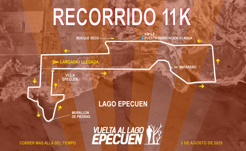 ¿CORRÉS 11K? Mirá por donde… Largada en el ingreso a las ruinas de Villa Epecuén, luego recorre un sendero de trail que atraviesa un bosque seco. Puesto de hidratación en el km. 5. En el km 7 ingresa a las ruinas de Villa Epecuén, luego de recorrerlas, se vuelve a la zona de largada.
